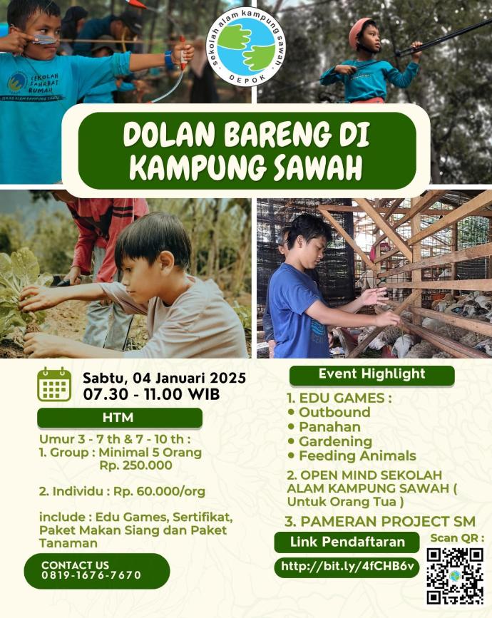Assalamu'alaykum Warahamtullahi Wabarakatauh.Hai para Ayah dan Bunda dan sahabat hebat. Kami mengundang Anda semua untuk bergabung dalam acara Dolan Bareng di Sekolah Alam Kampung Sawah Depok pada hari Sabtu, 14 Desember 2024, pukul 07.30-11.00 WIB. Sebuah pengalaman belajar penuh petualangan, keterampilan dan keceriaan di alam terbuka. Acara ini akan menjadi kesempatan berharga bagi anak-anak untuk belajar sambil bermain melalui kegiatan-kegiatan seru yang menantang dan mendidik.